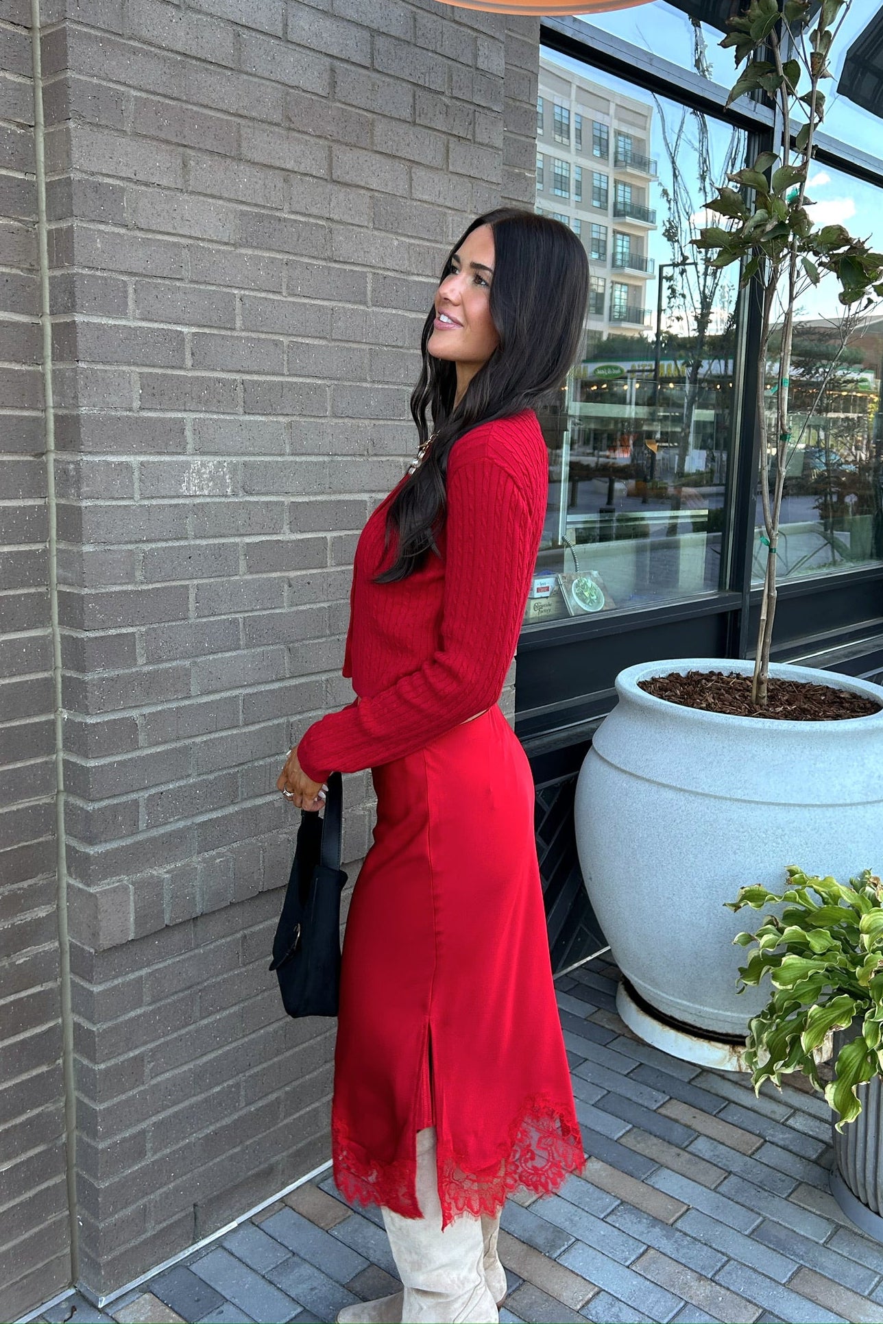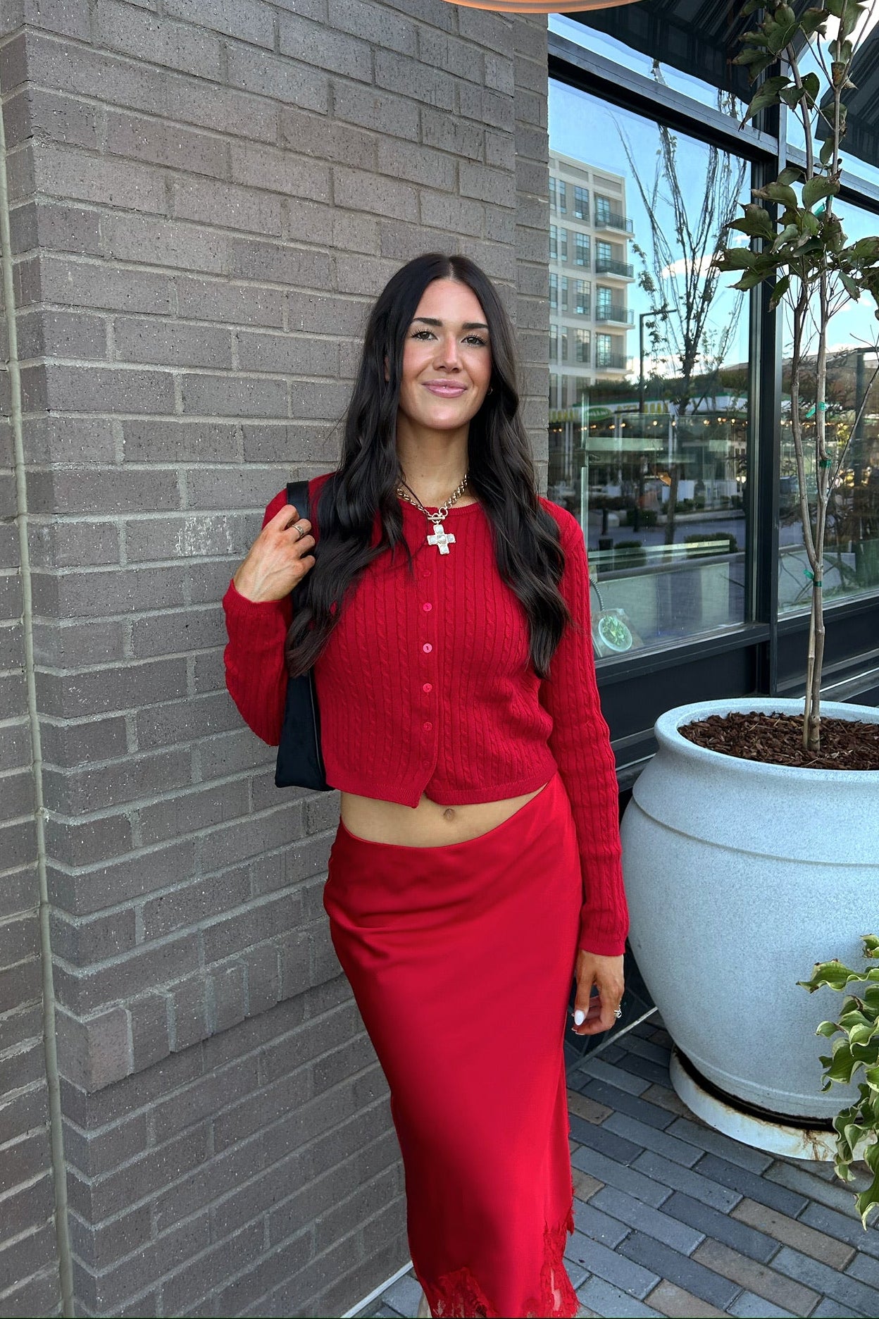 • Red cardigan