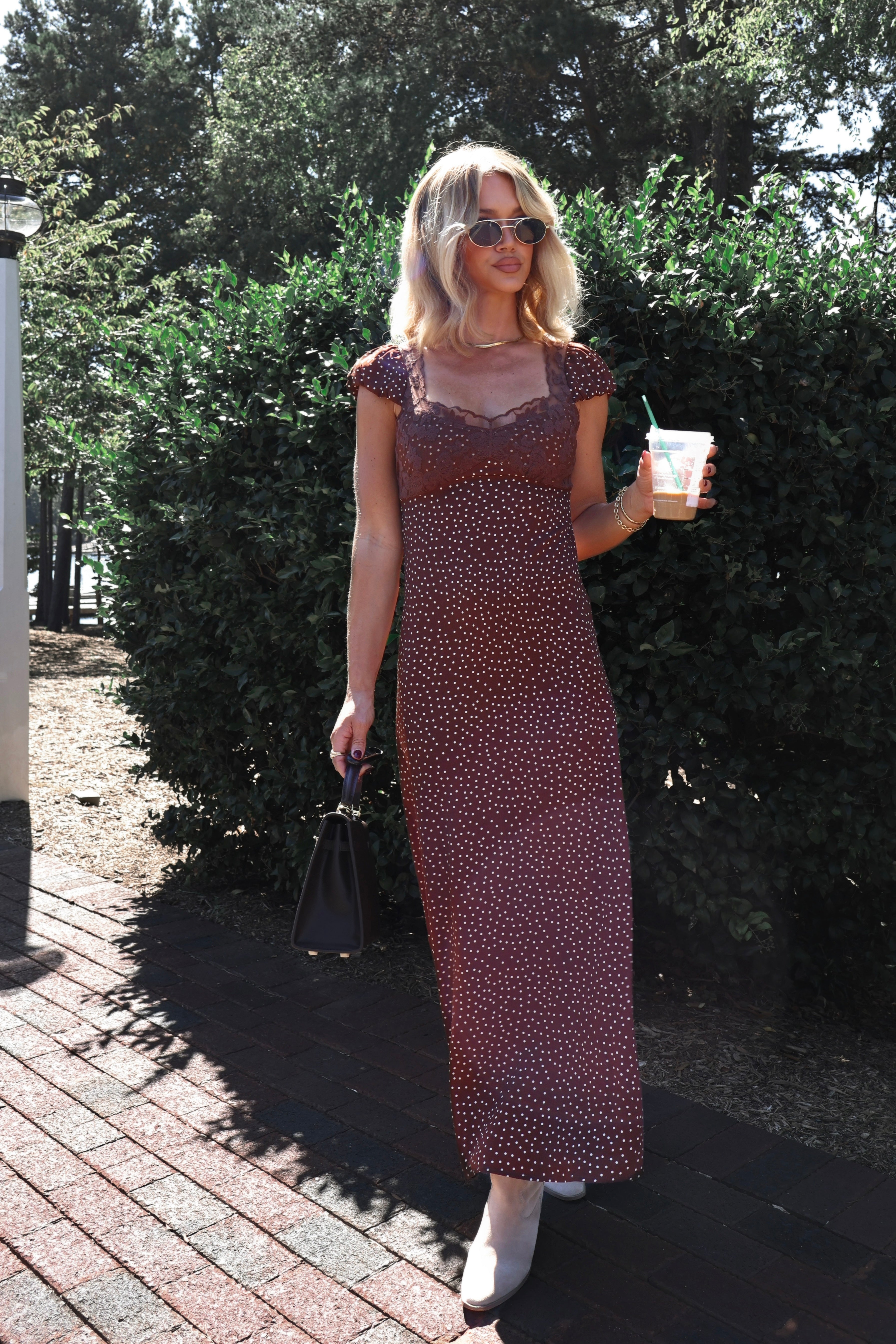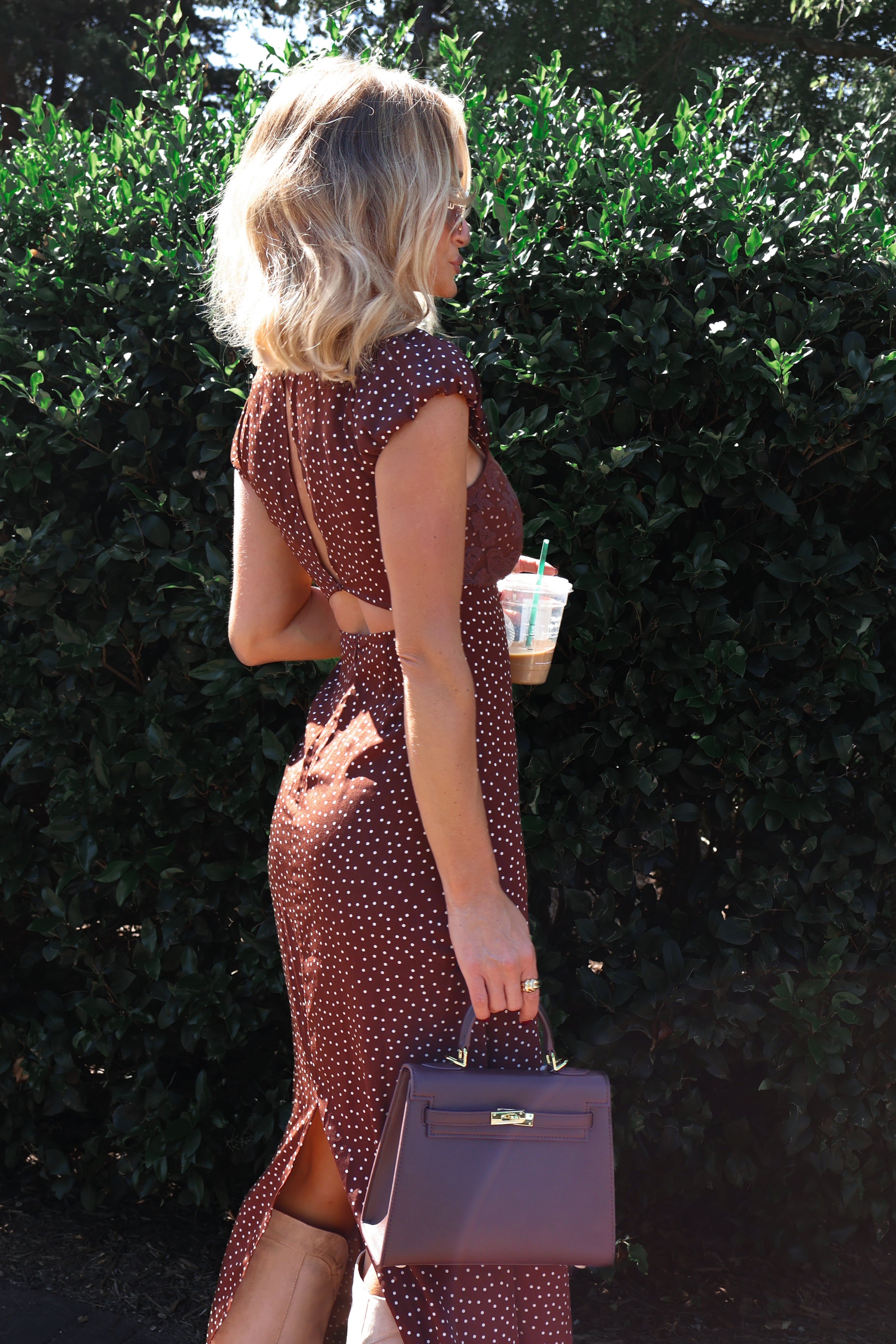 • Brown and white polka dot dress