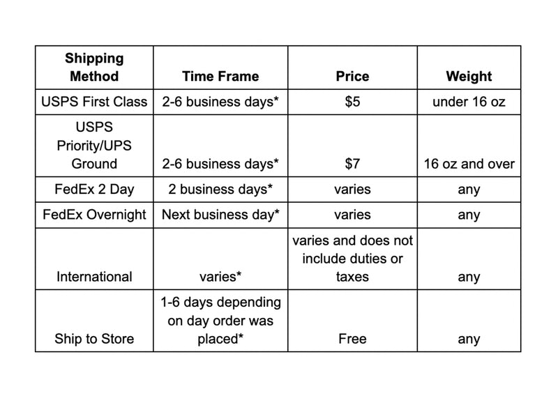 | USPS First Class | 2-6 business days* | $5 | Under 16 oz |